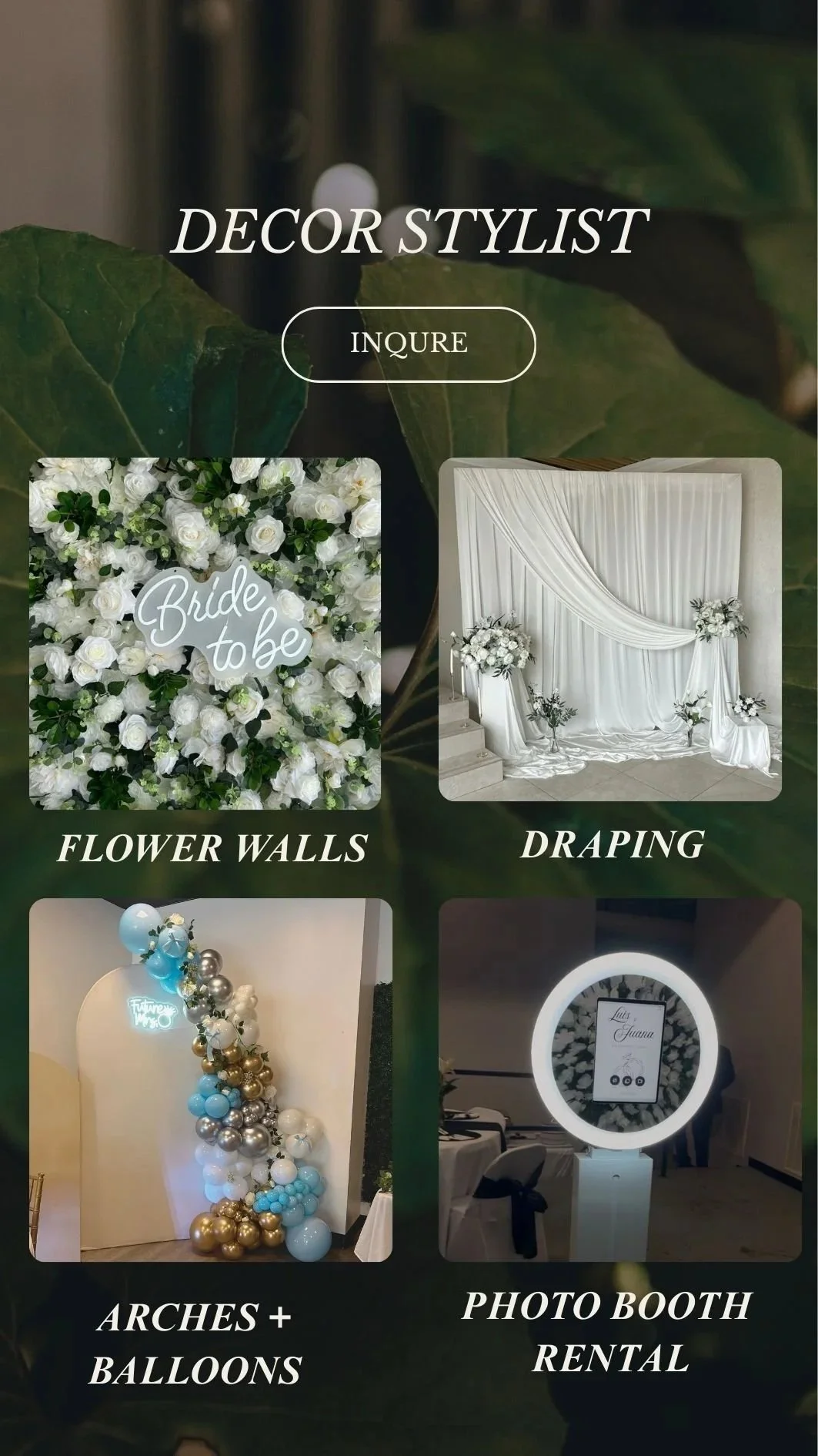 At Jireh Events Co., we design atmospheres — not just decorations. From statement arches and custom balloon installations to elegant draping, flower walls, grass walls, photo booths, and curated centerpieces, every element is styled with intention and cohesion.